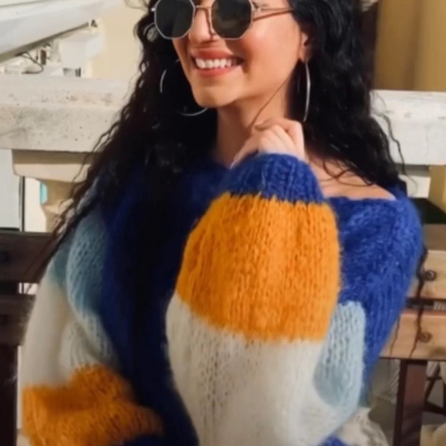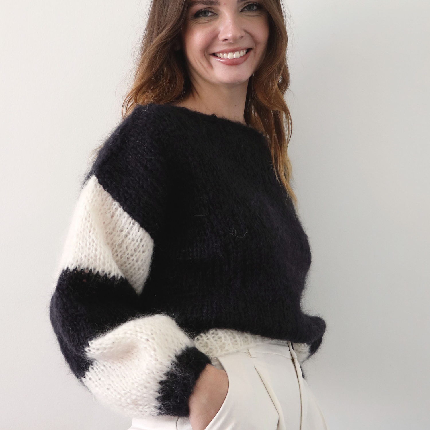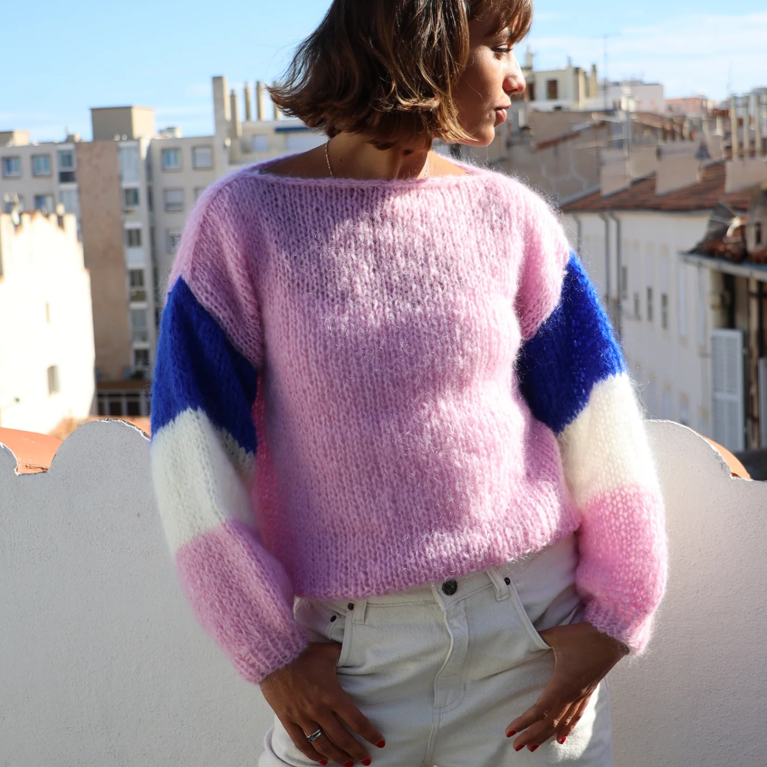 À partir de la base de notre iconique pull en mohair Colette, laissez vous porter par votre imagination pour poser vos couleurs de rayures, votre col et vos mesures.